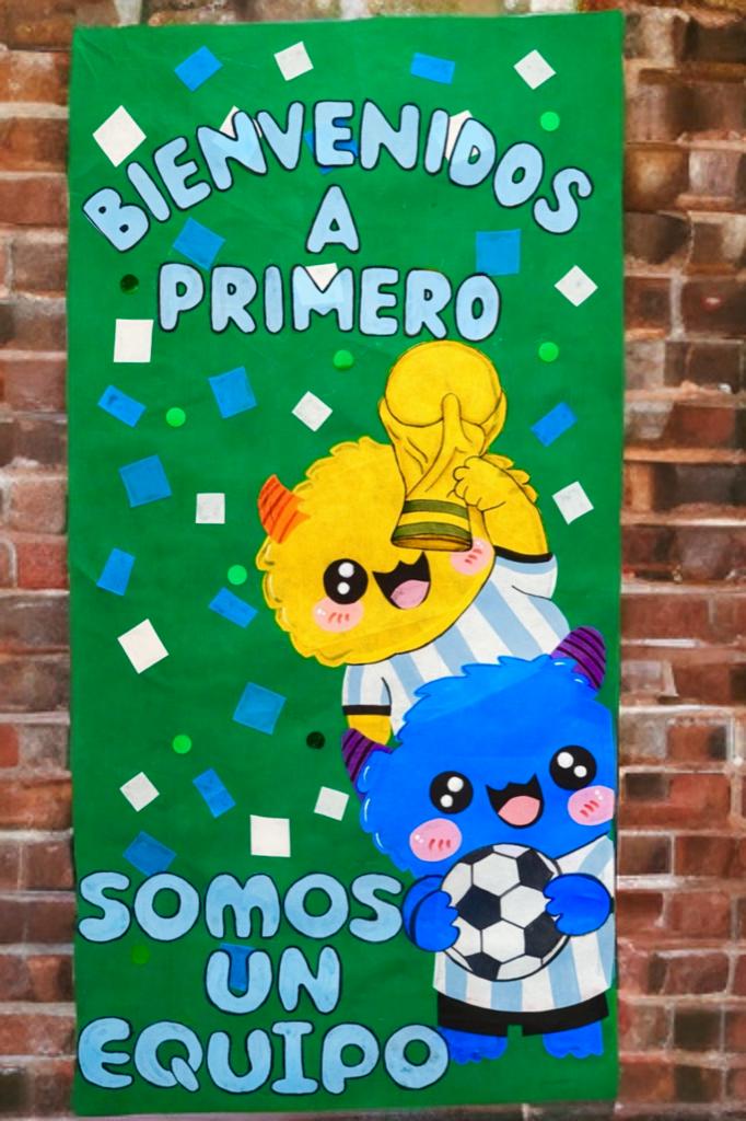Este modelo presenta personajes infantiles con temática fútbol y el mensaje “Bienvenidos, somos un equipo”, transmitiendo valores de compañerismo y trabajo en equipo.